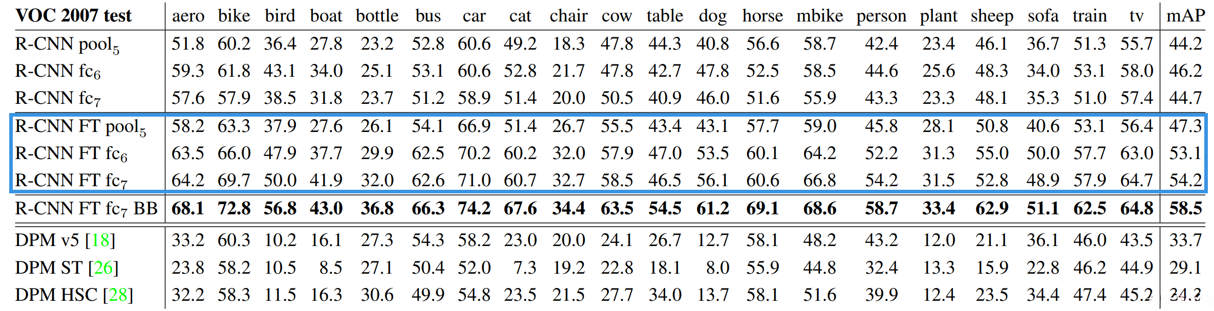 可以看到fc7的mAP提升了8%,且fc6和fc7层mAP的提升远大于pool5层