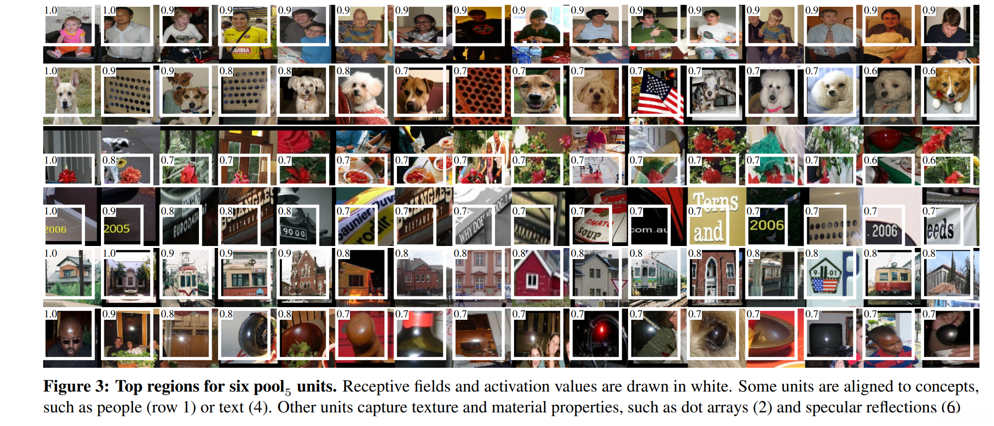 可以看出所选的六个unit各自涵盖了独特的知识体系;其中第一行聚焦于人脸特征识别,第二行则深入探究了狗的脸部结构及其图案排列方式;整个网络架构展示了在池化层5中提取的有效表征,并融合了基于类别特化的特征以及与形状、纹理等相关的细节信息