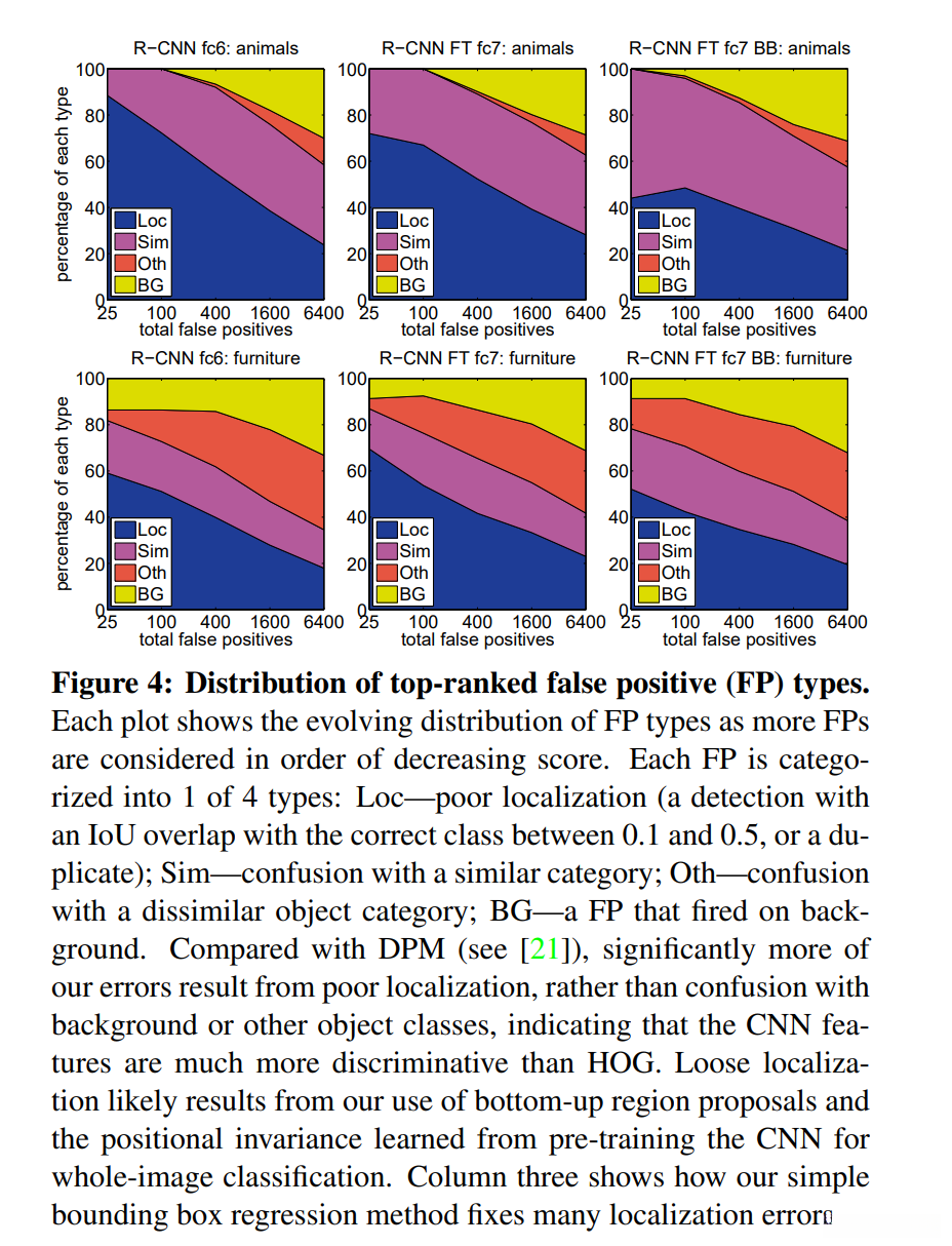 在进行误差分析时会发现存在定位误差。假设有标定的目标边界框和建议框,在某些情况下即使被分类器误识别为飞机。然而由于定位不够精确导致与其对比。其与真值边界框的IoU较低相当于未正确识别飞机