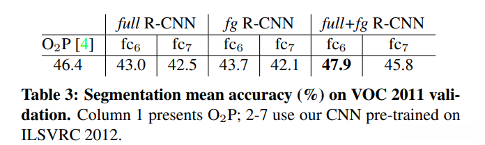 Region分类任务属于语义分割的标准方法之一。因此使得R-CNN在PASCAL VOC分割挑战中的应用成为可能。本文将目光转向同期领先的语义分割系统O2P,在保持一致性的前提下采用了他们的开源框架。首先基于CPMC的方法能从每张图像生成150个区域建议;其次在每个类别中使用支持向量回归(SVR)来评估这些区域的质量。此外在区域层面结合多特征类型的基础上采用二阶池化技术