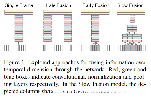 d)慢融合(Slow Fusion):该模型是上述两个的模型的中和。模型高层能够逐步得到更多时间和空间信息。第一层卷积核的T=4,clip为10帧,步长为2。第二和第三卷积层T=2,步长为2。