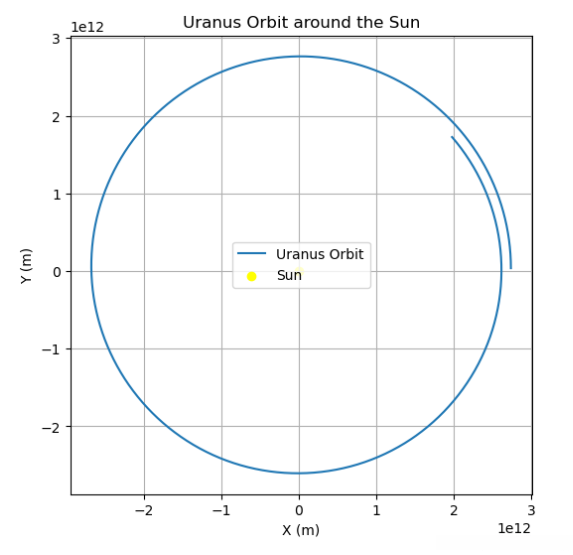 运行代码后,会显示天王星围绕太阳的轨道轨迹,类似椭圆形轨道。由于天王星的轨道偏心率小,轨迹接近圆形。你可以通过调整偏心率、轨道半长轴等参数来研究不同条件下的轨道变化。