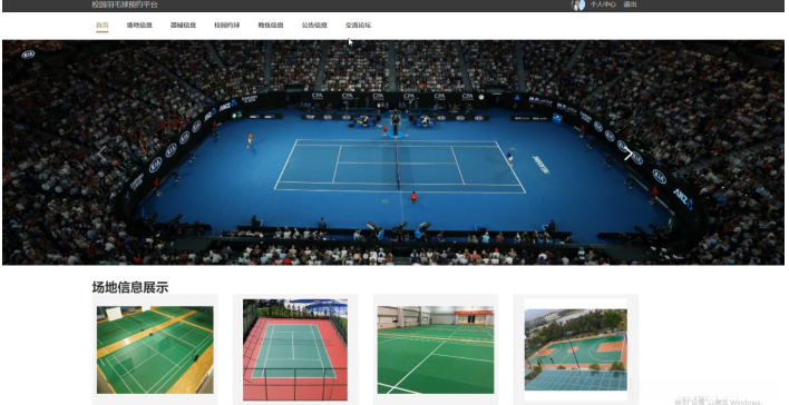 网站首页页面主要包括首页、场地信息、器械信息、校园约球、教练信息、公告信息、交流论坛、个人中心等内容,并根据需要进行详细操作;如图5-1所示: