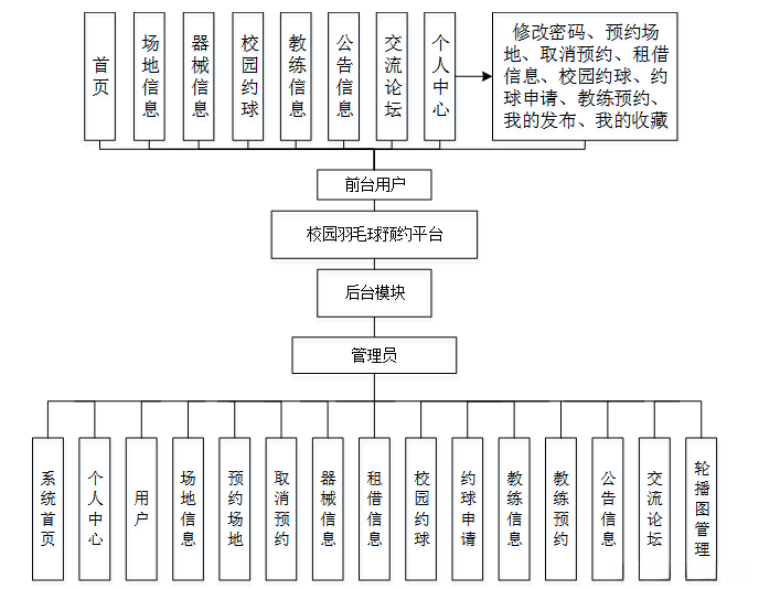 校园羽毛球预约平台的使用者主要有二类用户,一类是管理员,他拥有整个系统的最高权限,然后是用户,他具有管理员给予级别的权限,都只能对自己的个人信息进行操作。系统根据这二类用户,划分出了二大功能模块。