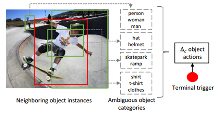 object category actions :这一动作是为了决定下一步的选择对象——宾语的类型。具体来说,在数据集中总共有1750个不同的类别标签,在此基础上增加了一个特殊的终端标记(terminal),当选择了这个特定的动作时,则表示需要切换主语角色。文章通过两个层面来缩小可能的动作范围:首先是从所有候选对象中筛选出与当前主语类别距离较近的对象类别集合;其次是在这个初步筛选结果的基础上进一步筛选出那些在DSAG(Dynamic Spatial Attention Graph)关系图中与当前主语类别存在连接关系的目标类别集合。确定完宾语类别的基础之后,在实际操作中根据object detector(物体检测器)给出的具体位置信息就可以反推出相应物体的位置坐标了。不过,在实际应用中可能会遇到同一类别中有多个物体的情况(即多个具有相同名称或属性的对象),作者在此处没有明确说明如何处理这种情况,默认情况下建议可以根据实际情况进行筛选处理即可完成任务