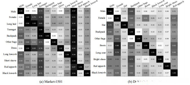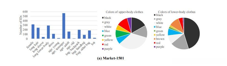 人工给 Market-1501 与 DukeMTMC-reID 数据库赋予了属性标签。这些标签均源自于大学环境中的数据采集,并且主要集中在采集于不同时间段的研究者身上。在 Market-1501 中观察到多数参与者着装较为轻便,多选择裙子或短袖装;而在 DukeMTMC-reID 数据库中则普遍选择了长裤等更为正式的穿着方式。因此,在处理这两个数据库时采用了各自独特的属性集合。