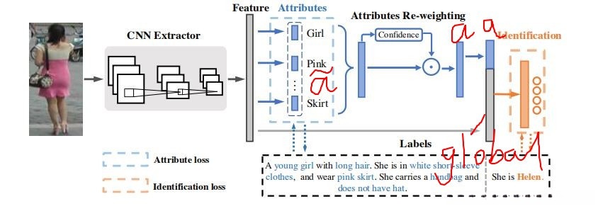 由APR网络构成的体系主要包括两个核心模块:一个是负责进行 attribute 识别的任务(attribute classification task),另一个是负责 identity recognition 的任务(identity classification task)。给定一张行人的照片后,在处理过程中首先利用卷积神经网络(CNN)提取行人的 feature 信息。随后,在基于这些图像 feature 的基础上进行 attribute 识别。为了衡量 attribute 识别结果与真实 label 之间的差异程度,在每个 attribute 维度上计算对应的 loss 值以获得 loss 矩阵。在 identity classification 部分中,则通过局部区域描述符(attribute)来辅助整体 identity 的识别过程,在这种情况下将各 attribute 识别结果作为进一步 identity 确认的具体依据。