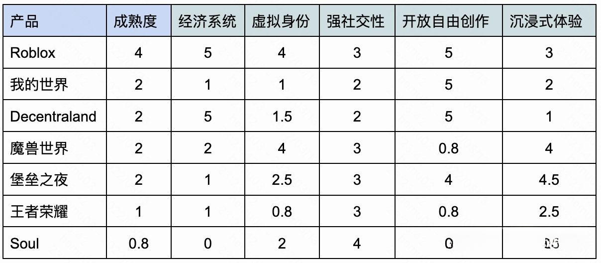 (各产品元宇宙成熟度评估)