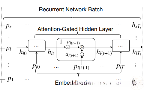 综上所述,在注意力门控循环网络中对ui与vj的所有有效路径进行整合处理后会生成一个统一的循环网络批处理结构其中每一个注意力门控循环网络负责编码一条具体的路径信息