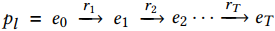 假定实体对(ui, vj)通过s个不同长度的不同路径(p_1, p_2, \dots, p_s)相连;值得注意的是s是一个动态变化的数量;对于任何一个长度为T的具体路径p_l而言,在这种情况下其形式可表示为p_l = e_0 \xrightarrow{r_1} e_1 \xrightarrow{r_2} e_2 \dots \xrightarrow{r_T} e_T, 其中规定起点与终点分别为e_0 = ui, e_T = vj.