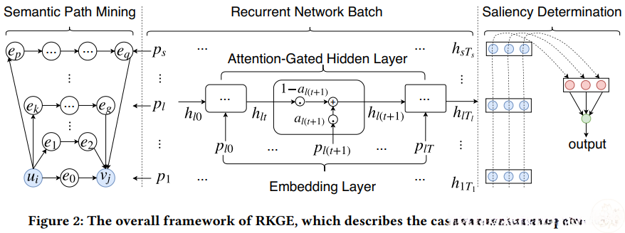 该循环网络通过学习每个实体及其关联路径的语义特征来生成路径表示,在该模型中(RKGE架构),目标模块主要由两部分构成:首先是一个嵌入层[embedding layer]负责提取基本特征;其次是一个注意力门控隐藏层[attention-gated layer]用于强化关键信息。