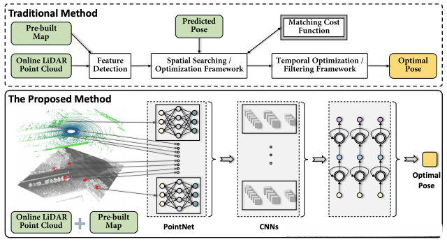 百度论文—作者使用神经网络以厘米级的精度定位在预先构建的LIDAR地图中。他们表明,所产生的性能可与最先进的手工方法相媲美。