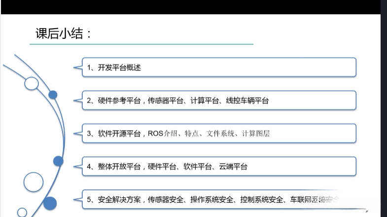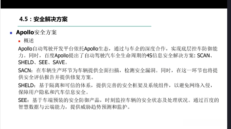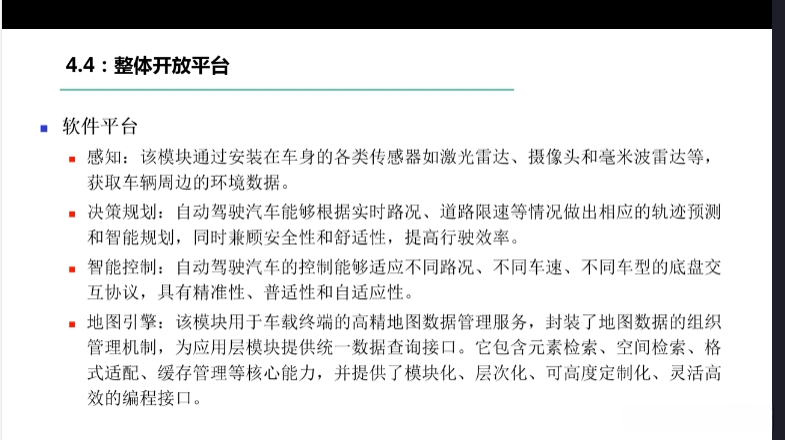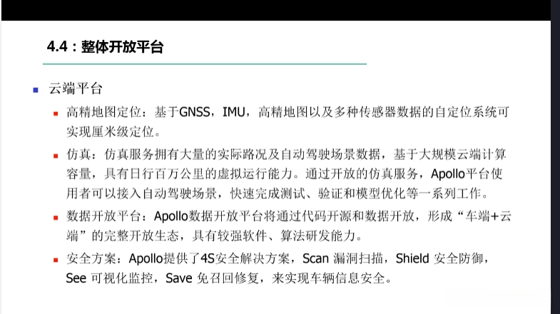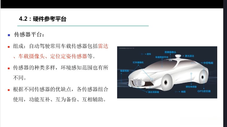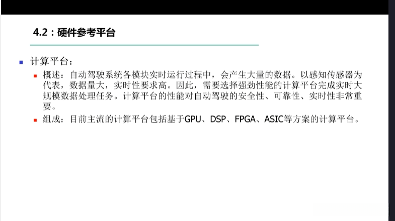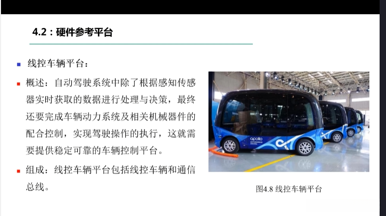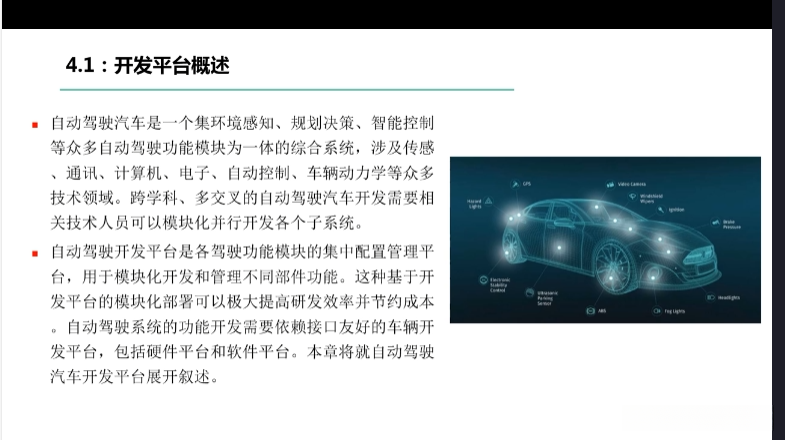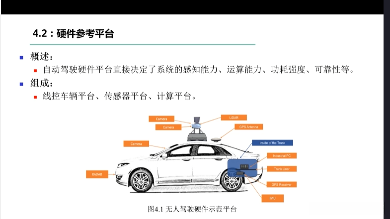 第一章自动驾驶技术概论第四节自动驾驶汽车开发平台 4.1开发平台概述 4.2硬件参考平台 4.3软件开源平台 4.4整体开放平台 4.5安全解决方案