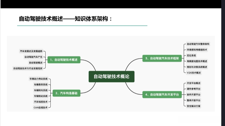 第一章自动驾驶技术概论第三节自动驾驶汽车技术架构 3.1自动驾驶汽车整体架构 3.2环境感知传感器技术 3.3定位系统 3.4定位系统高精地图技术概述 3.5规划与决策系统概述 3.6V2X技术概述