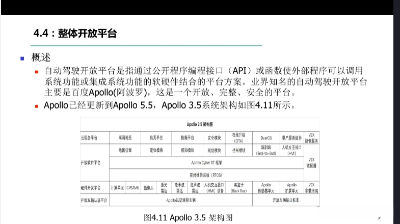 第二章自动驾驶汽车平台技术基础第四节典型自动驾驶汽车开发平台 4.1百度自动驾驶平台Apollo发展历程 4.2Apollo架构 4.3Apollo功能模块介绍 4.4Apollo特点