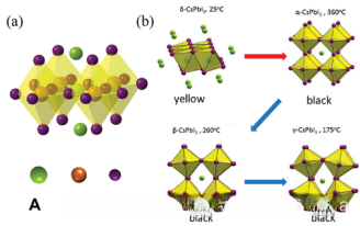 b) CsPbI₃晶体经历热力学性质变化,在吸收力较强的黑色α-型阶段达到较高的转换温度(约360°C)。当温度降至较低水平时(例如低于该临界值),立方对称性被破坏导致钙钛矿晶体发生形变,并被分别命名为β-型和γ-型结构。随后于25°C时发生进一步变化(δ型),此时材料呈现黄色外观。