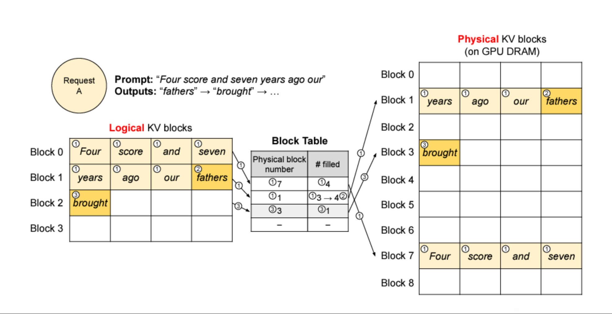 假设每个 block 可以用来存 4 个 token 的 kv cache 数据。一个句子的 token 在逻辑层面是紧邻的,每次 decoding 生成新的 token 就往空闲的 block 里放。但是对应到物理层面的 block,一个句子的 token 可能分布在并不相邻的 block 内,不过没关系,vLLM 会为每个句子的每个 token 记录逻辑和物理 block 的映射关系,方便查找和读取。