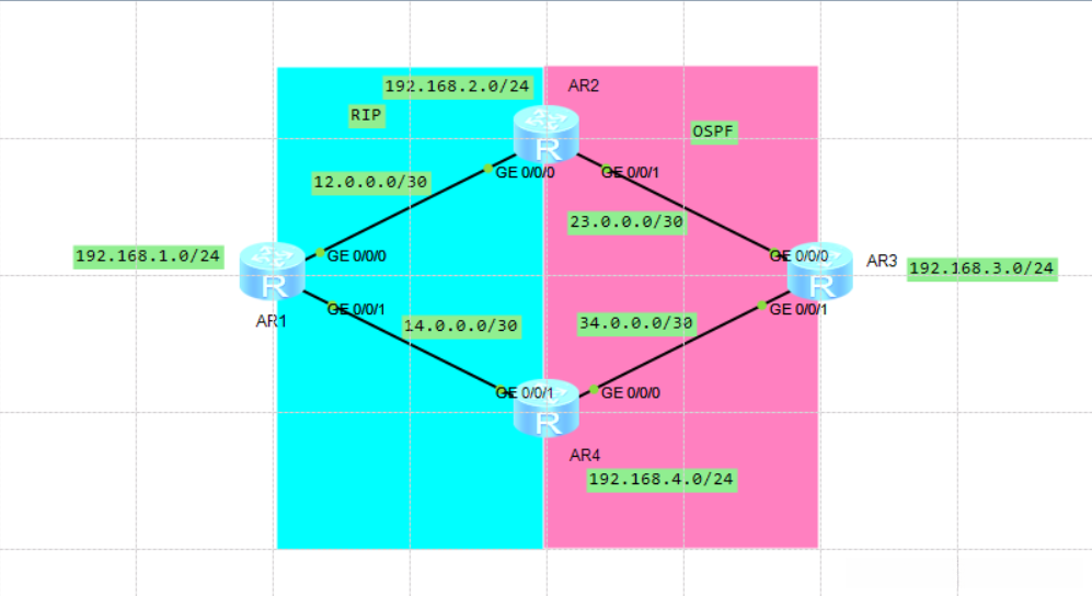 双路:两个协议间实现相互导入(A,B协议的路由互相共享)