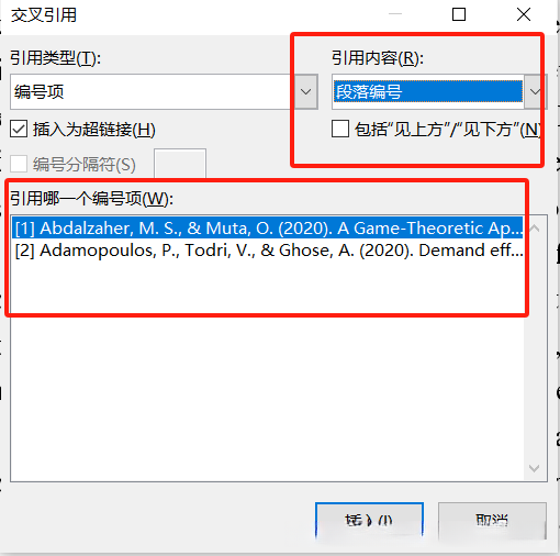 第三步:选择“编号项”、“段落编号”、对应参考文献,点击插入