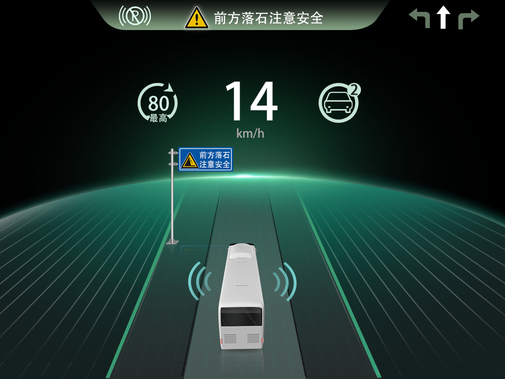 限速提醒指的是通过RSU设备获取公交车所在路段的限速值,然后再通过车载单元OBU将限速值显示在屏幕上,对驾驶员来说非常具有参考意义,避免公交车的超速行驶。