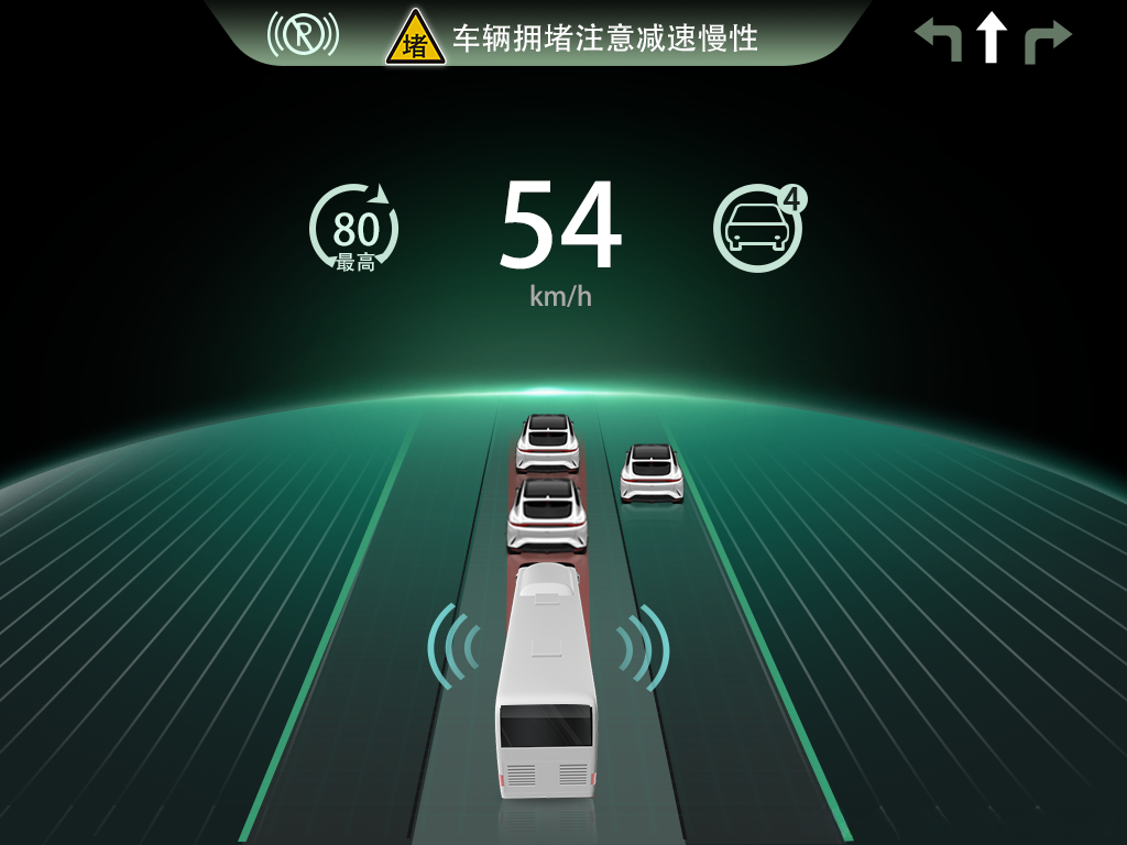 道路拥堵提示指的是通过毫米波雷达检测到道路拥堵情况,通过路侧单元RSU设备广播出来,车载单元OBU在接收到路侧单元发送的拥堵信息后,将会显示在屏幕上,并且显示拥堵程度,拥堵路段等信息。