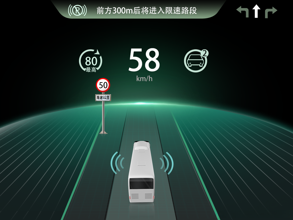 该功能的显示最大的好处在于它能全程显示整个路段的限速值,这样有效避免了因驾驶员太过专注驾驶而没有看到路侧标牌限速值,同时当车辆超速行驶该功能在显示或者语音上都有警示,更加有效的避免了公交车的超速行驶行为。