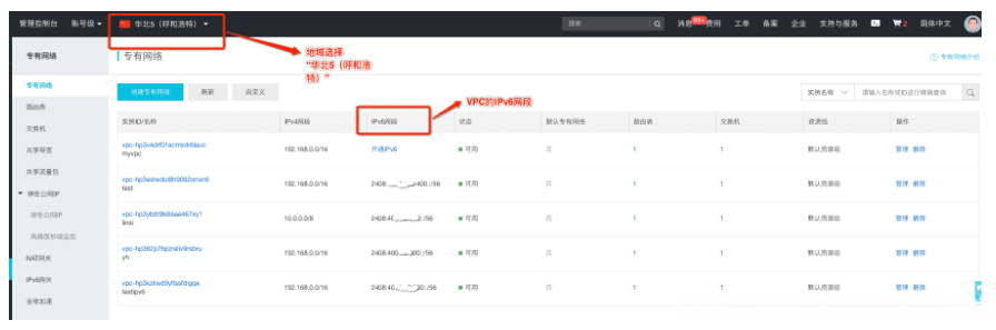 进入阿里云**专有网络VPC控制台** 并将区域设置为“华北5(呼和浩特)”。