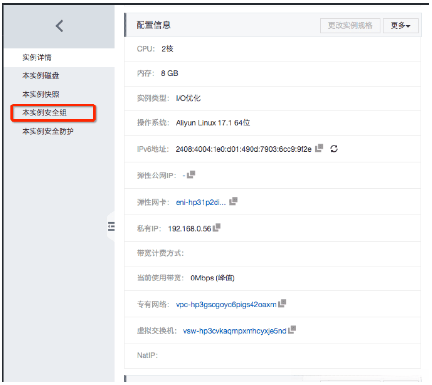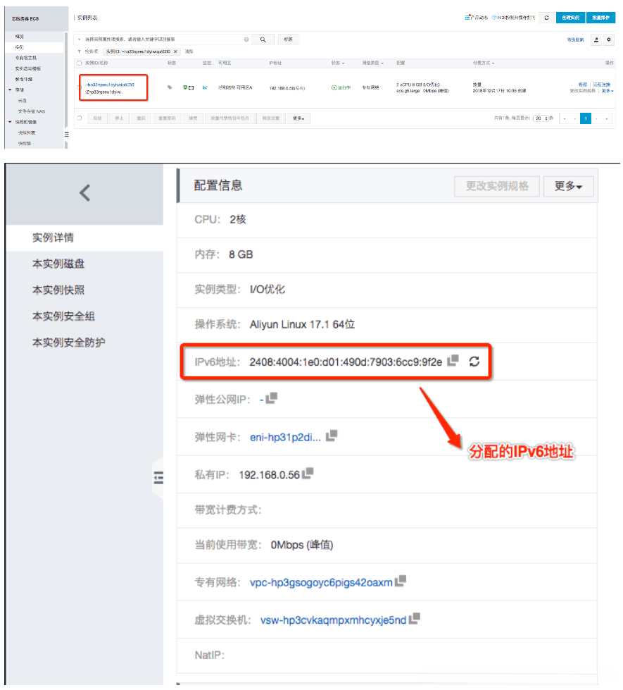 2.4、前往 ECS实例列表页 ,单击对应的ID号码,并打开该页面后进行操作。在 配置信息 一栏中可查看系统为 ECS 分配的 IPv6 地址。