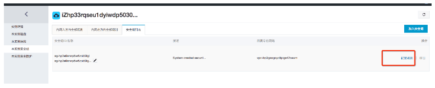 在ECS详情页左侧导航栏中进行操作时,请先选择 本实例安全组 ,然后,在安全组列表页面点击 配置规则 按钮。