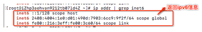 4.2 执行 ip addr | grep inet6 指令,并检查 ECS 实例的 IPv6 地址信息是否就绪。如上图所示,配置好的 IPv6 服务已就绪