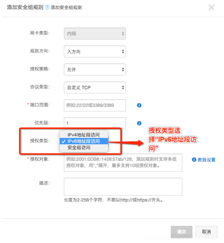 完成之后创建 ECS 的安全组出方向,默认允许所有类型的访问(包括支持了 IPv4 和 IPv6 地址段),您可以根据需求设置安全组以指定 IPv6 地址段的入方向访问策略。