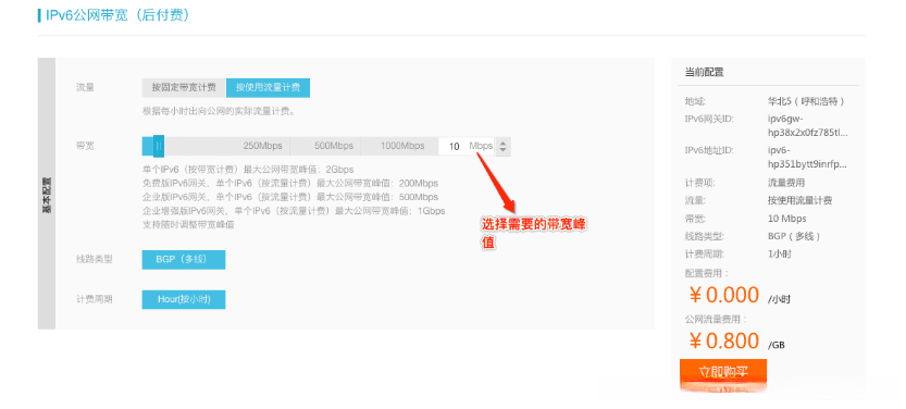 5.3、进入IPv6公网带宽的计费页面,在线根据需求选择合适的公网计费方式和对应的带宽峰值参数设置后,请完成支付并完成下单操作