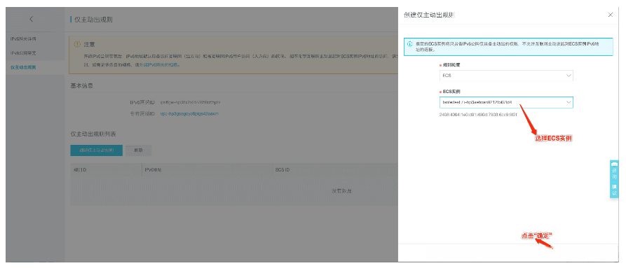 在右滑页面选择需要设置IPv6公网仅主动出权限的ECS实例,单击确定 。