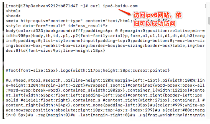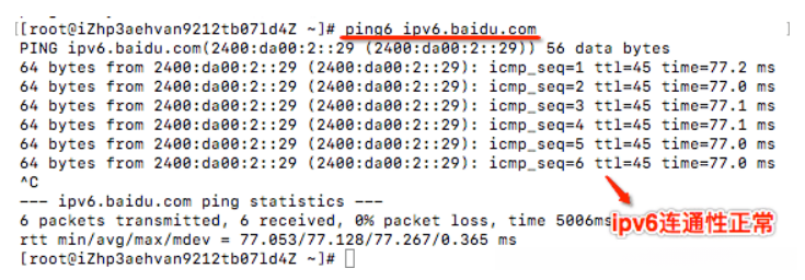 首先通过远程登录访问刚创建的ECS实例,并在上面执行以下操作:尝试连接具备IPv6地址的网站以验证该实例是否支持IPv6连通性。