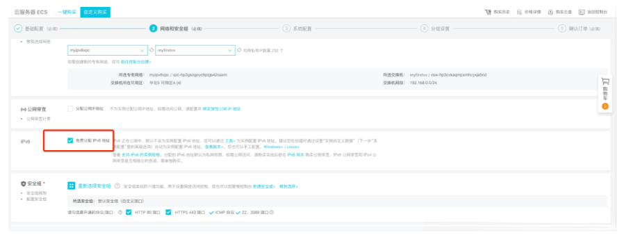 2.3、在ECS购买页面网络和安全组 页面选择为ECS实例免费分配IPv6地址 。