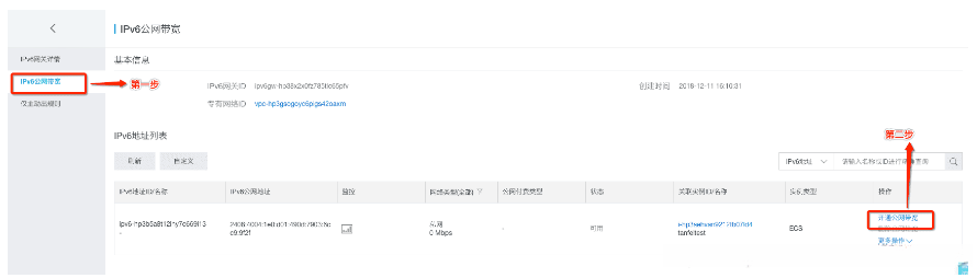 在左侧导航栏中点击IPv6公网带宽后,在该页面中可以看到当前VPC下的所有实例的IPv6地址。请从该列表中选择一个需要开通该服务的IPv6地址并继续下一步操作。然后点击右侧弹出窗口中的开通公网带宽 按钮以完成配置。