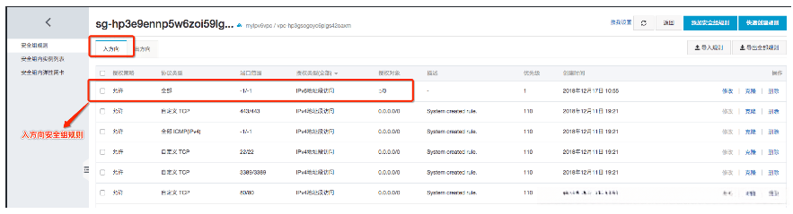 如下图所示,ECS实例的入方向对任意IPv6地址段进行放行。