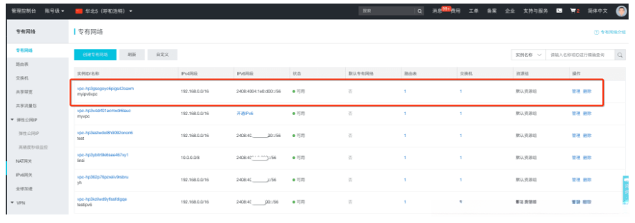 在 VPC 的列表页面 进行访问 刚才创建 的 IPv6/IPv4 双层结构 VPC
