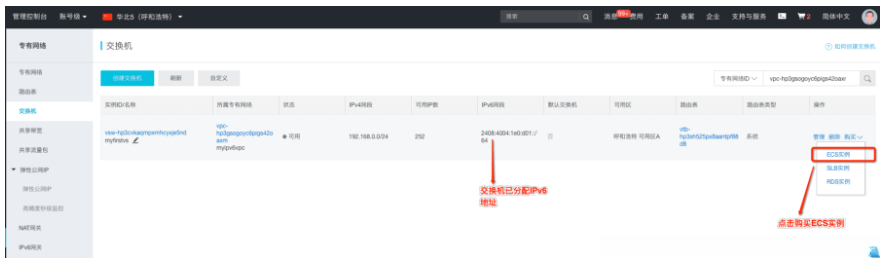 2.1、在已开通了IPv6的交换机列表页,进入并选择并配置ECS实例。
