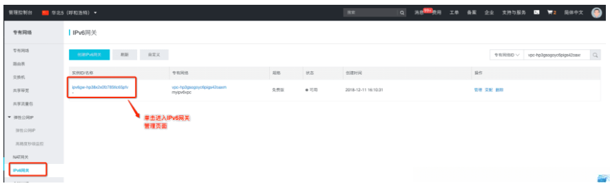 5.1、 访问该 IPv6 网关控制台网页地址 https://vpc.console.aliyun.com/ipv6/cn-huhehaote/ipv6s ,可以查看 VPC开通 IPv6 时系统自动创建的免费版 IPv6 网关信息。单击 IPv6 网关实例 ID 标签以进入管理界面。