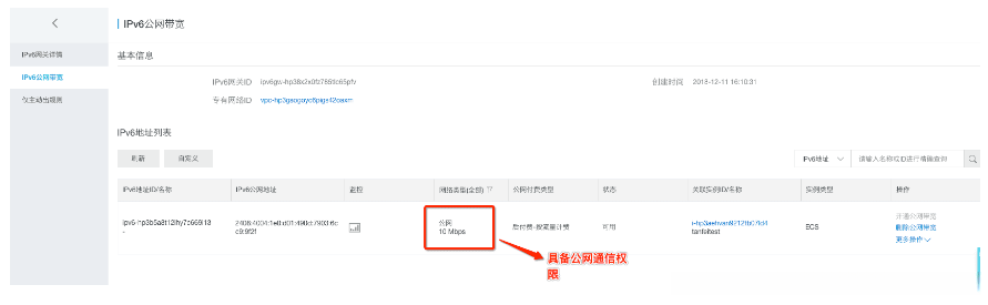 在IPv6地址列表下方单击刷新按钮即可显示已开通的 IPv6 公 twins带宽信息,并非所有具备 IPv6 公 twins带宽的 IPv6 地址都拥有 IPv6 通信权限
