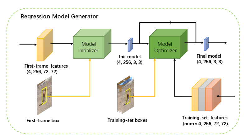 该回归模型由初始化模块与优化模块组成。其中初始化模块基于第一帧的回归特征及边界框(即4个3×3、256通道的空间滤波器)构建初始参数。该模块采用大小为3×3的区域响应池化操作,并仅在第一帧数据上进行学习。随后将训练集的所有样本及其对应边界输入至优化模块中进行迭代更新以获得最优参数设置。在线回归训练损失函数定义如下:L(f)= \frac{1}{N}\sum_{(X,c)\in S_{train}} |M^{(c)}_{reg}-X^{(c)} \ast f|_2 + |\lambda f|_2