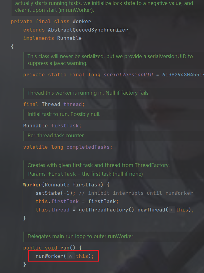 看来上面源码还是讲不清楚,到底咋终止非核心线程的呀?compareAndDecrementWorkerCount() 方法么?这个方法看起来只是在线程池处于终止状态时通过原子的方式减少线程池的线程数。显然不是靠他来回收空闲的非核心线程,这时候我觉得得从 Worker 这个类来看。