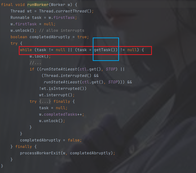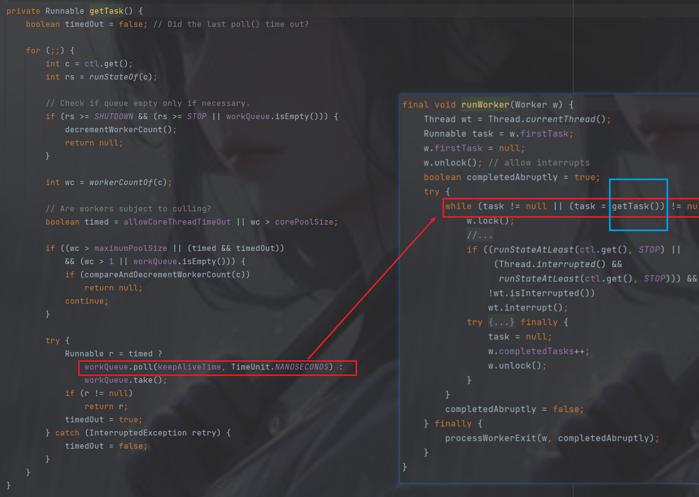 我们知道线程池其实内部就是将普通的线程包装成 Worker 线程,那么当线程执行任务其实也就是调用 run 方法,而在 run 方法内部其实会调用 getTask() 去尝试获取任务。这就和上面的 poll 串起来了: