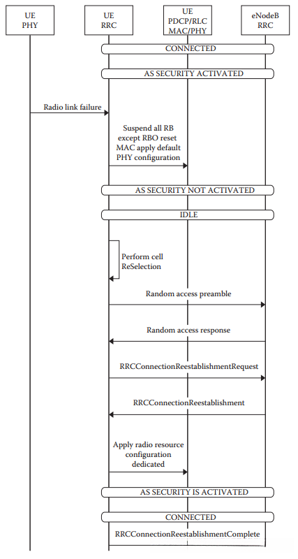 一旦UE检测到无线电链路出现故障,则可以选择启动RRC重连接流程,并具体细节请参考3.7.11节。该过程可采取两种路径之一:要么直接触发RRC重建过程(Reconnection Process),要么将当前状态从CONNECTED状态转变为IDLE状态(Inactivity State)。进入IDLE状态后,在完成相关操作前,请确保已解绑对应的SRB(Shared Resource Block)与DRB(Dynamic Resource Block)资源,并根据系统指示执行小区切换以确定新的接入小区。