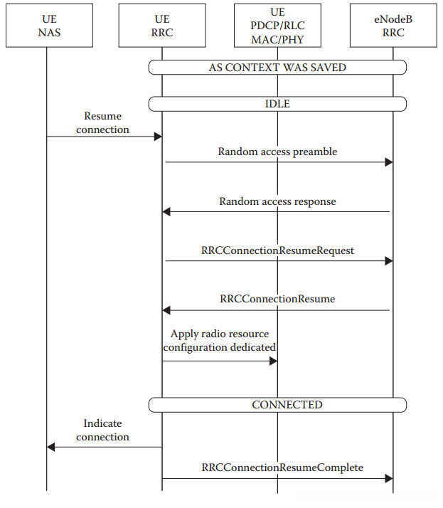 当eNodeB释放RRC连接时,则会执行RRC连接暂停操作。 eNodeB可在空闲模式中发起请求以保留包含UE能力的UE AS上下文。此相关的过程将在第3.7.12节中得到详细说明。
