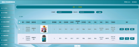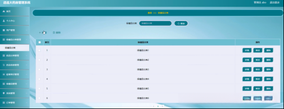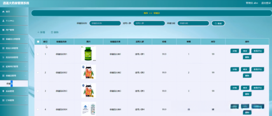 保健品分类管理位于其特有的保健品分类管理页面上,在此页面上可提供索引导航栏内的所有产品信息,并允许用户查看详细信息以及执行编辑操作(包括修改和删除)。如图所示