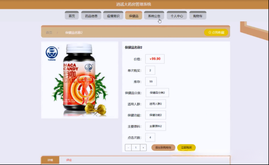 用户登录该系统后具有多种功能模块支持包括首页药品信息疫情常识保健品系统公告个人中心购物车等让用户方便使用