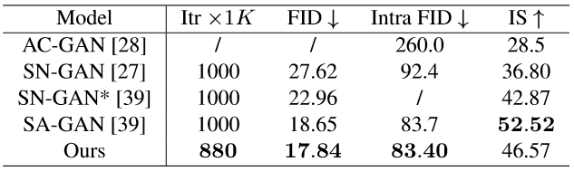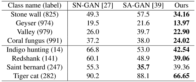 从表2可知,在对自然场景或纹理(第一大行)以及复杂结构关系(第二大行)的处理上,AN均在Intra FID指标上(越低越好)显著超越了SN-GAN,且极少数任务不及SA-GAN。
