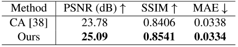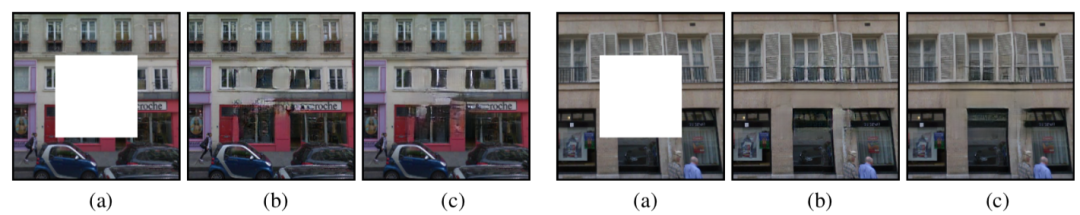 图9:Paris Streetview数据集上,生成式图像修复任务对比,(a)输入图像,(b)CA结果,(c)本文结果